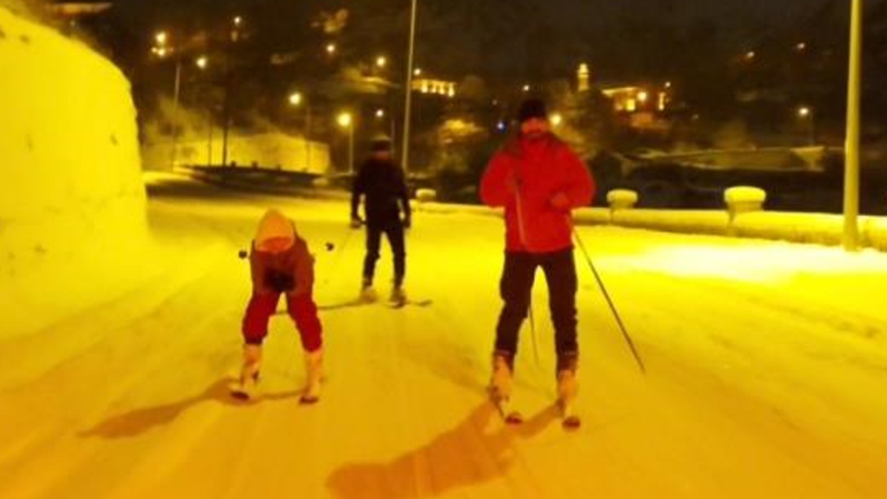 Yoğun kar yağışının ardından karla kaplanan yolda kayakla kayan sporcular, hem spor yaptı hem de izleyenlere keyifli anlar yaşattı. Kent merkezine kadar süren inişte zaman zaman zor anlar yaşayan sporcular, buna rağmen eğlenceli görüntüler ortaya çıkardı.