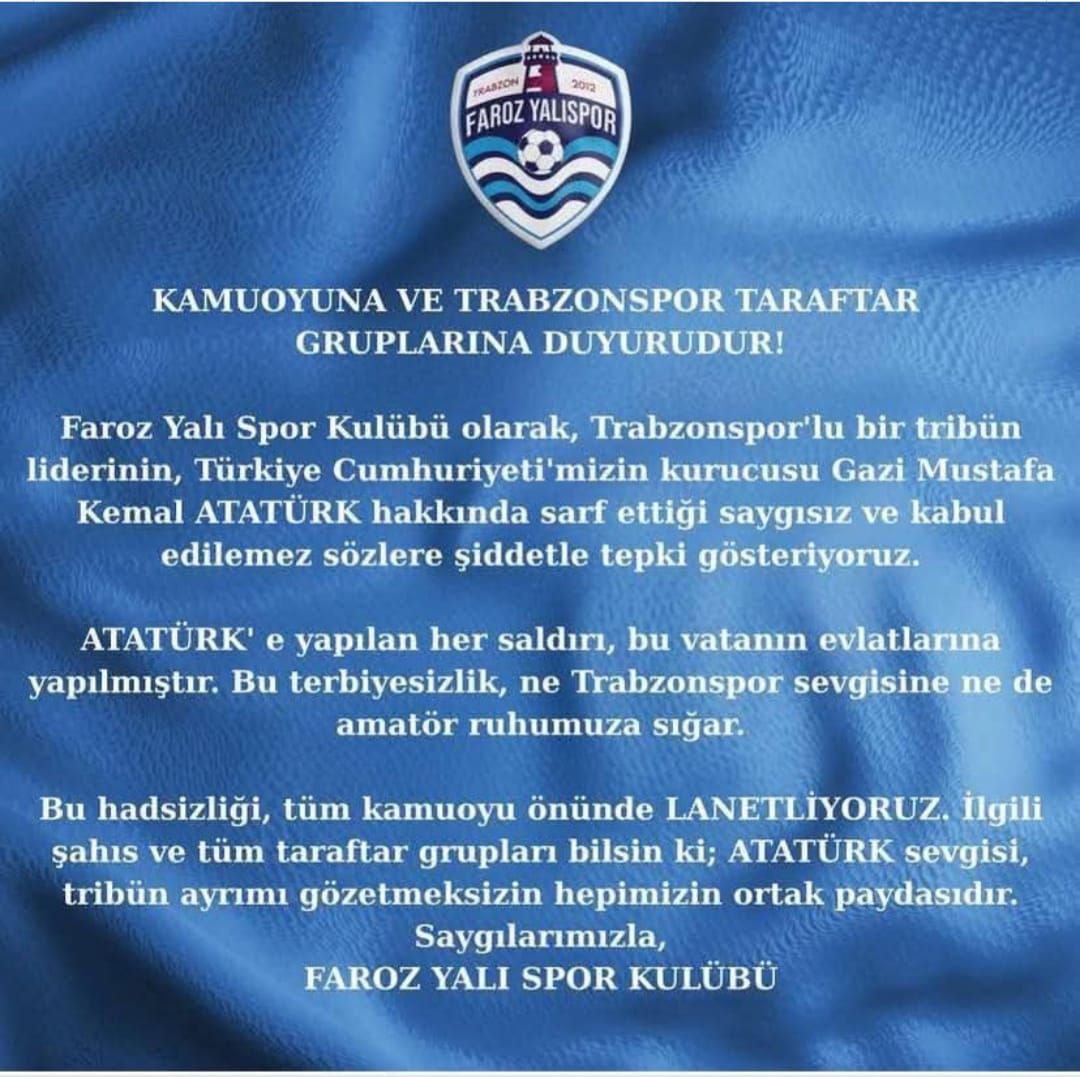 Faroz Yalı Spor Kulübü, Trabzonspor'un bir grubun lideri tarafından Mustafa Kemal Atatürk’e yönelik sarf edilen sözlere çok sert bir açıklamayla tepki gösterdi. Yapılan açıklamada, "Faroz Yalı Spor Kulübü olarak, Trabzonsporlu bir tribün liderinin, Türkiye Cumhuriyeti’mizin kurucusu Gazi Mustafa Kemal Atatürk hakkında sarf ettiği saygısız ve kabul edilemez sözlere şiddetle tepki gösteriyoruz. Atatürk’e yapılan her saldırı, bu vatanın evlatlarına yapılmıştır. Bu terbiyesizlik, ne Trabzonspor sevgisine ne de amatör ruhumuza sığar. Bu hadsizliği, tüm kamuoyu önünde Lanetliyoruz. İlgili şahıs ve tüm taraftar grupları bilsin ki; Atatürk sevgisi, tribün ayrımı gözetmeksizin hepimizin ortak paydasıdır." ifadeleri kullanıldı.