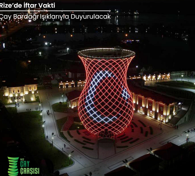 Rize’nin simgelerinden biri haline gelen çay bardağı, iftar saatinde bardağın üzerindeki LED aydınlatmalar eş zamanlı olarak yanıyor. Vatandaşların yoğun ilgi gösterdiği Çay Çarşısı’ndaki bardak ışıklandırması, Ramazan atmosferine anlam katarken, iftar saatinde meydanda manevi bir buluşma noktası oluşturdu. Çay Çarşısı Yönetimi, Ramazan ayının birlik ve beraberlik ruhunu pekiştirmek için böyle bir uygulama başlattıklarını dile getirdiler.