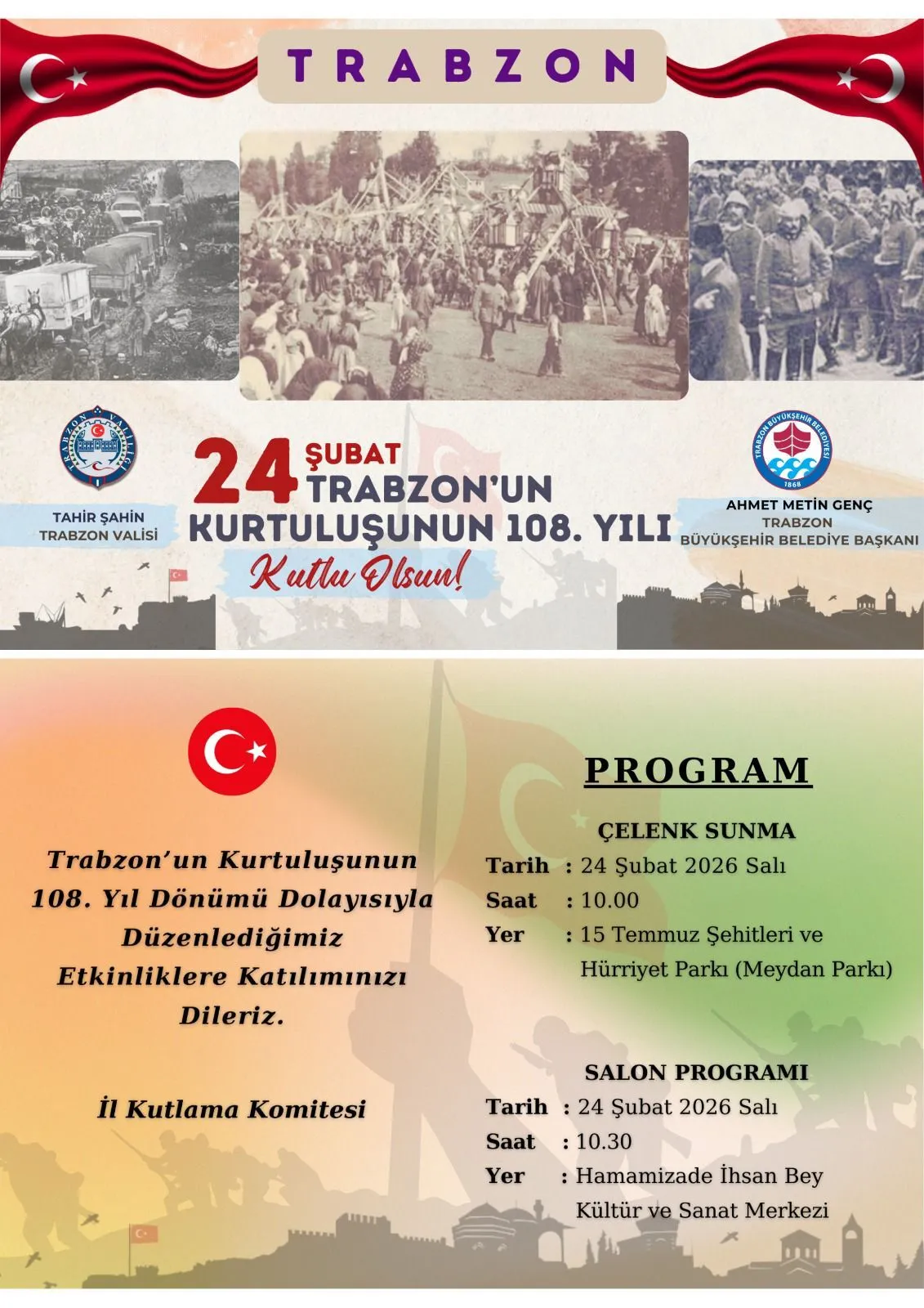 Trabzon’un kurtuluşunun 108. yılı, 24 düzenlenecek etkinliklerle kutlanacak. Trabzon Valiliği ve Trabzon Büyükşehir Belediyesi tarafından organize edilen program kapsamında, hem açık alanda hem de salonda programlar düzenlenecek. Kent protokolü ve vatandaşların katılımıyla gerçekleşecek etkinliklerde, kurtuluş mücadelesi bir kez daha hatırlanacak. Kutlamalar saat 10.00’da 15 Temmuz Şehitleri ve Hürriyet Parkı’nda başlayacak. Burada gerçekleştirilecek çelenk sunma töreninde, Trabzon’un kurtuluşunun 108. yılı dolayısıyla Atatürk Anıtı’na çelenk bırakılacak. Törenin ardından katılımcılar, programın ikinci bölümüne geçecek. Saat 10.30’da ise Hamamizade İhsan Bey Kültür ve Sanat Merkezi’nde salon programı yapılacak. Günün anlam ve önemine ilişkin konuşmaların yer alacağı programda, kurtuluş mücadelesinin tarihi yönü ve Trabzon için taşıdığı değer vurgulanacak.