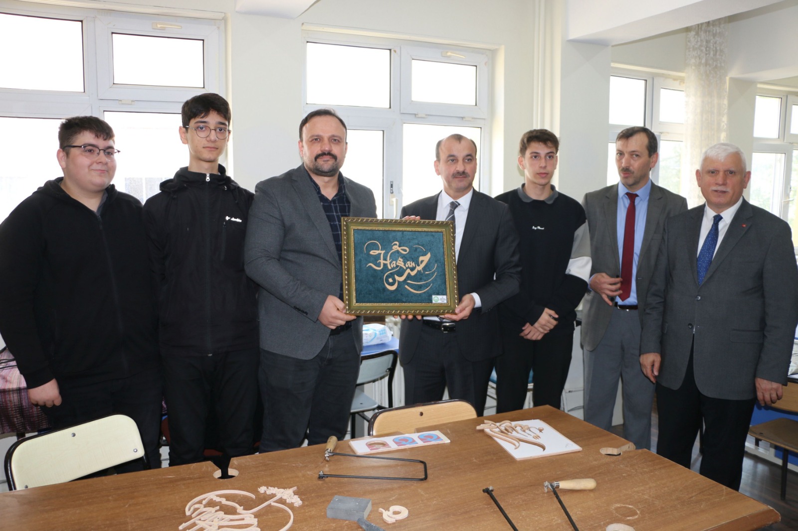 Özellikle Selçuklu ve Osmanlı dönemlerinden günümüze ulaşan Naht sanatı ile yapılan eserleri inceleyen Uygun’a öğrenciler tarafından hazırlanan bir ahşap oyma çalışması hediye edildi.