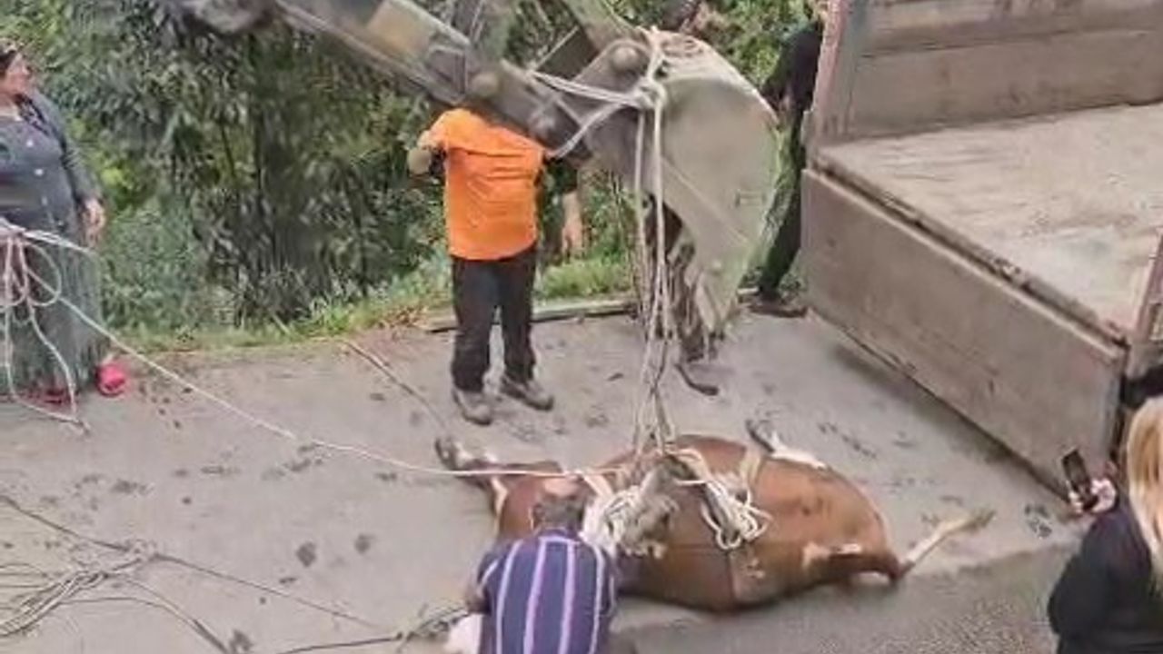 Rize’nin Çamlıhemşin ilçesinde yoldan aşağıya yuvarlanan inek bulunduğu yerden vinçle kurtarıldı.