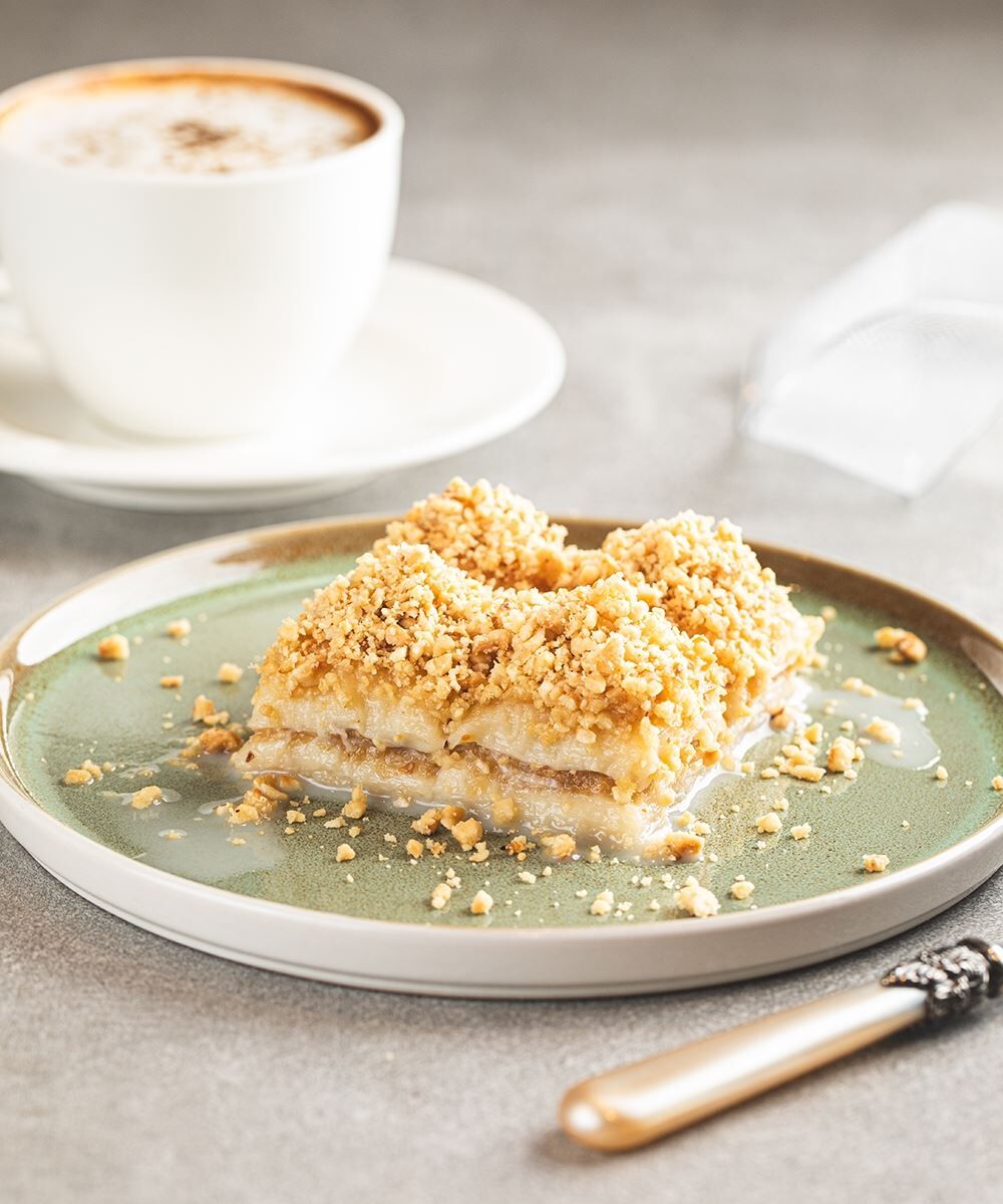 Yufkaları tereyağı ile kat kat diz. Ortasına ceviz koy. Dilimle ve 170°’de kızart. Ilık tatlıya ılık sütlü şerbet dök. 2-3 saat dinlendir.