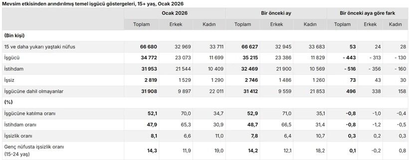 TÜİK’in Hanehalkı İşgücü Araştırması sonuçlarına göre, Ocak 2026’da mevsim etkisinden arındırılmış işsizlik oranı yüzde 8,1 olarak kaydedildi. Bu oran, önceki aya göre 0,3 puanlık artışı temsil ediyor. İşsiz sayısı ise 73 bin kişi artarak 2 milyon 819 bine ulaştı.