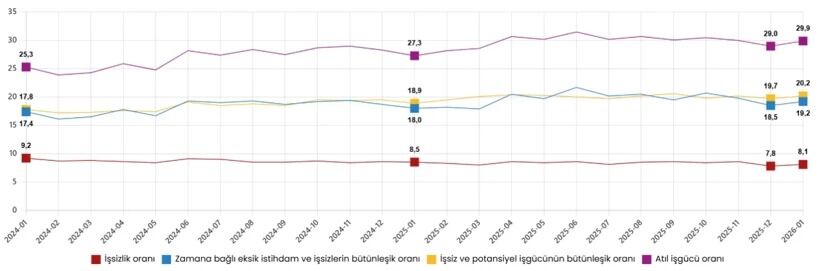Zamana bağlı eksik istihdam, potansiyel işgücü ve işsizleri kapsayan atıl işgücü oranı Ocak 2026’da 0,9 puan artışla yüzde 29,9 oldu. Zamana bağlı eksik istihdam ve işsizlerin bütünleşik oranı yüzde 19,2, işsiz ve potansiyel işgücünün bütünleşik oranı ise yüzde 20,2 olarak hesaplandı.