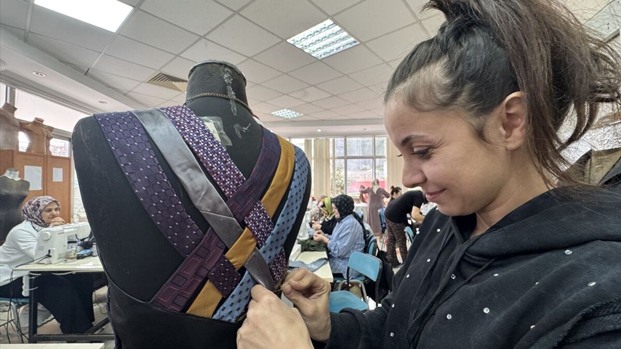 Eşlerinin yıllardır kullanmadığı eski kravatlardan yola çıktıklarını anlatan Erdin, 'Burada kursiyerlerimizle beraber evde kullanılmayan kravatlar, kumaş atıkları, kot pantolonlar, yani her ne olursa olsun dışarıya atılacak malzemeleri değerlendirmek istedik. Aklımıza gelen ilk kravatlar oldu. Malum beylerimiz işe giderken takıyor ama bazı kravatlar yıllardır kullanılmadığı için hem modası geçiyor hem de eskiyor. Bunlar ziyan olmasın diye düşündük. Kravatlardan abajurlar yaptık, etekler yaptık, yelekler yaptık ve kullanmaya başladık.' dedi.
