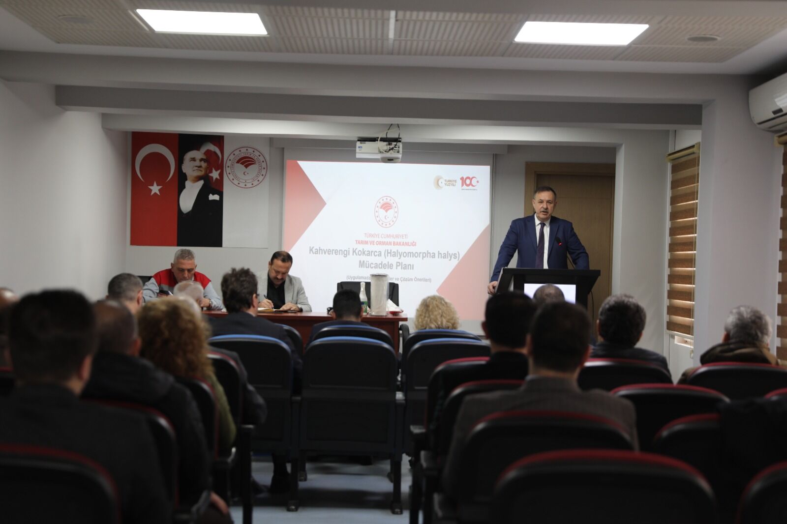 Kahverengi kokarca ile mücadele kapsamında düzenlenen toplantıda, sahada uygulanacak yöntemler detaylı şekilde ele alındı. Zararlının yayılımını önlemek ve etkisini azaltmak amacıyla biyolojik ve biyoteknik mücadele yöntemlerinin kapsamı genişletildi.