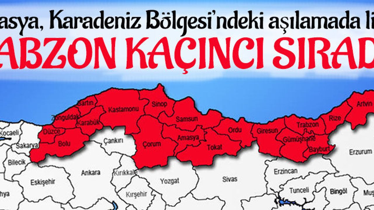 Karadeniz Bölgesi’nde 18 il arasından en az 1 doz aşı olmuş 18 yaş ve üstü aşı oranı en yüksek il Amasya (yüzde 78,8) oldu. İkinci sırayı yüzde 75,3 ile Ordu aldı. Yüzde 74,9 aşılama oranına sahip Bartın listede üçüncü sırada yer alırken, yüzde 74 aşılama oranına ulaşan Giresun 4. sırada yer aldı. Bolu yüzde 72,9 aşılama oranı ile 5. oldu. Sinop ve Artvin yüzde 72,7 aşılama oranı ile 6 ve 7. sırayı paylaştılar. 8 ve 9. sırayı paylaşan Çorum ve Zonguldak’ın aşılama oranı ise yüzde 71,7 oldu. Kastamonu yüzde 70,7 aşılama oranı ile listede 10. sırada yer aldı. Karadeniz’in en büyük şehri olan Samsun aşılamada yüzde 70,1’de kalarak 11. sırada yer aldı. Yüzde 68,5 aşılama oranı ile Tokat 12'nci, Trabzon (yüzde 68,4) 13'üncü, Karabük (yüzde 67,9) 14'üncü, Rize (yüzde 67,4) 15'inci, Düzce (yüzde 66,6) 16'ıncı, Bayburt (yüzde 54) 17'nci ve Gümüşhane (yüzde 49,3) ile 18'inci sırada yer aldı.