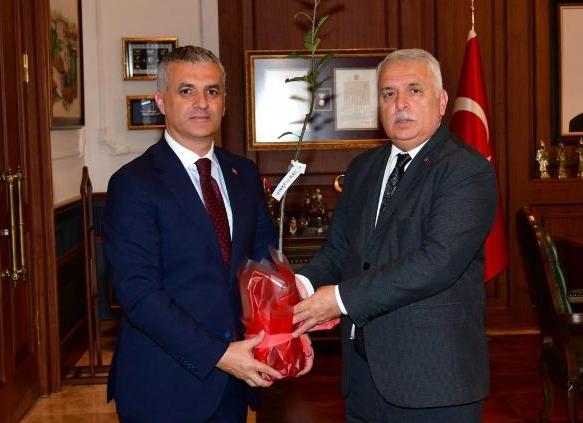 Yomra Belediye Başkanı Mustafa Bıyık, Trabzon Valisi Aziz Yıldırım’ı ziyaret ederek Yomra elmasının fidanını takdim edip ilçedeki faaliyetlerle ilgili bilgi verdi.