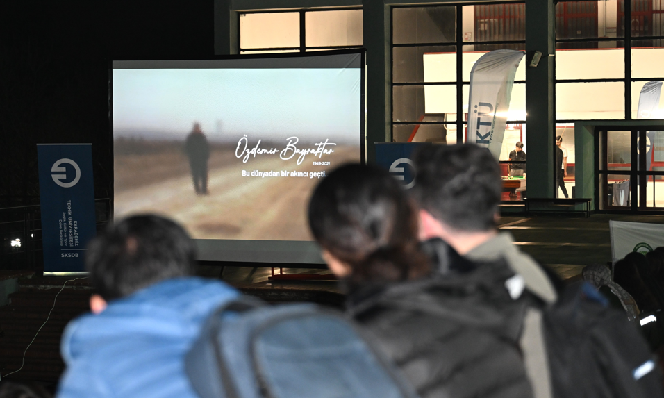 Karadeniz Teknik Üniversitesi’nde (KTÜ), “Milli İHA ve SİHA Projesi”nin fikir babası merhum Özdemir Bayraktar’ın hayatını konu alan belgesel, açık hava gösterimiyle öğrenciler ile buluştu. Hasan Polat Spor Salonu önündeki Açık Hava Amfi alanında düzenlenen programa; KTÜ Rektörü Prof. Dr. Hamdullah Çuvalcı, Sağlık Kültür ve Spor Daire Başkanı Ömer Salimoğlu, akademik ve idari personel ile öğrenciler katıldı. Program kapsamında davetliler, KTÜ'lü öğrencilerin seslendirdiği şarkıları dinledi. Gösterim öncesinde katılımcılara, çeşitli ikramlarda bulunulurken düzenlenen bilgi yarışmasıyla öğrenciler hem Özdemir Bayraktar’ın hayatına hem de Türkiye’nin Savunma Sanayii alanındaki atılımlarına ilişkin bilgilerini pekiştirme imkânı buldu.
