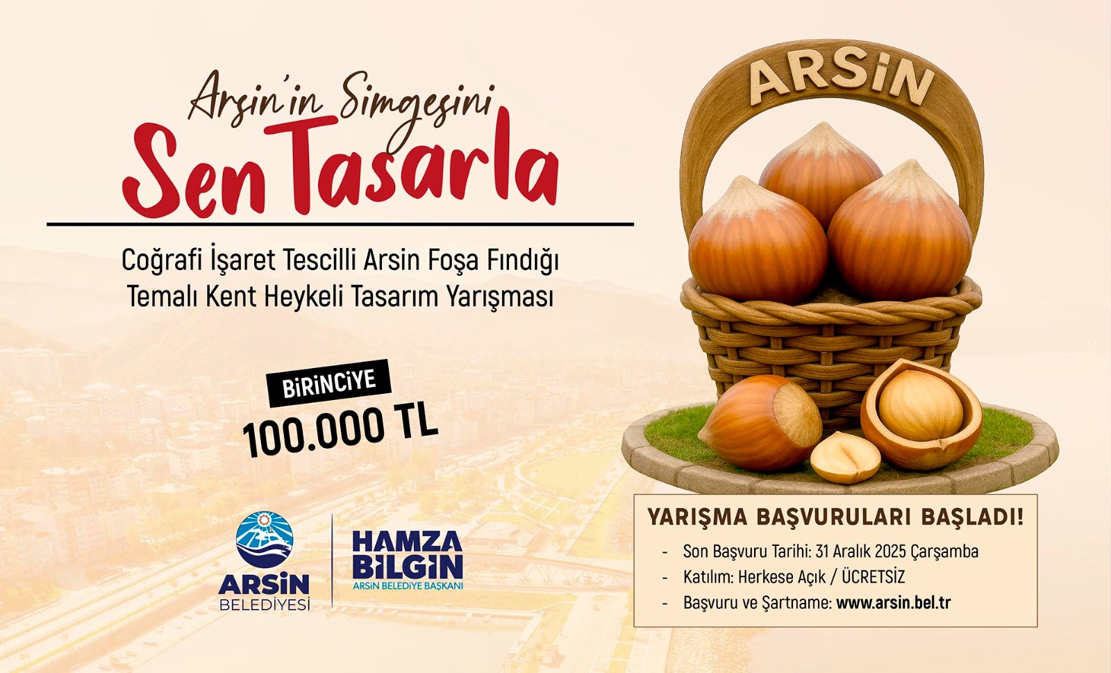 Arsin Belediyesi’nin, ilçenin kültürel değerlerini ve estetik anlayışını ön plana çıkarmak amacıyla düzenlediği “Arsin Belediyesi Temalı Kent Heykeli Tasarım Yarışması” için başvurular 31 Aralık 2025 tarihinde sona erecek. “Arsin’in Simgesini Sen Tasarla” başlığıyla gerçekleştirilen “Coğrafi İşaret Tescilli Arsin Foşa Fındığı Temalı Kent Heykeli Tasarım Yarışması” kapsamında, Arsin’in giriş ve çıkış noktalarında sergilenecek özgün heykel tasarımları seçilmesi hedefleniyor.