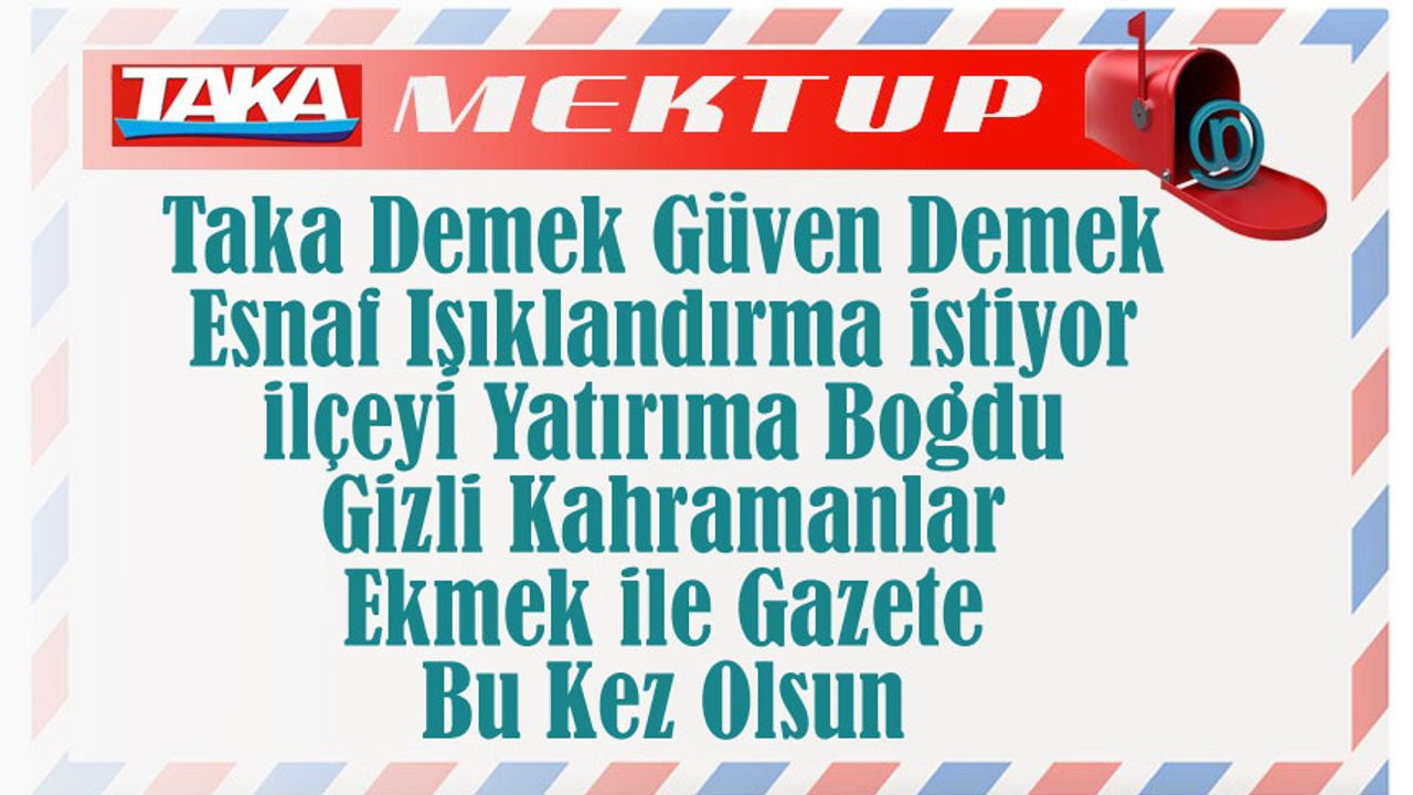 Değerli Okurlar, Yerel gazeteciliğe tam 60 yılını veren merhum Hikmet Aksoy abimiz ‘Ekmek ile gazetenin fiyatları başa baş gider’ derdi. Şimdi ise ara açıldı. Bir ekmek 30 TL’den satılırken gazetelerin fiyatı 10 TL’de kaldı. TAKA Gazetesi olarak sizlerin desteğine inanarak gazetemizi 2026 yılının başında 15 TL’ye yükselttik. Bizi anlaşıla karşıladığınız için teşekkür eder, sevgi ve saygılarımızı sunarız.