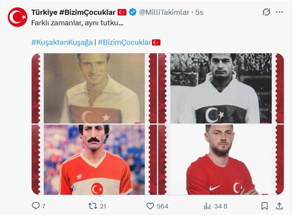 A Milli Futbol Takımı’nın “farklı zamanlar, aynı tutku… Kuşaktan kuşağa, bizim çocuklar” temalı paylaşımında Trabzonspor’un formda ismi Mustafa Eskihellaç da yer aldı.