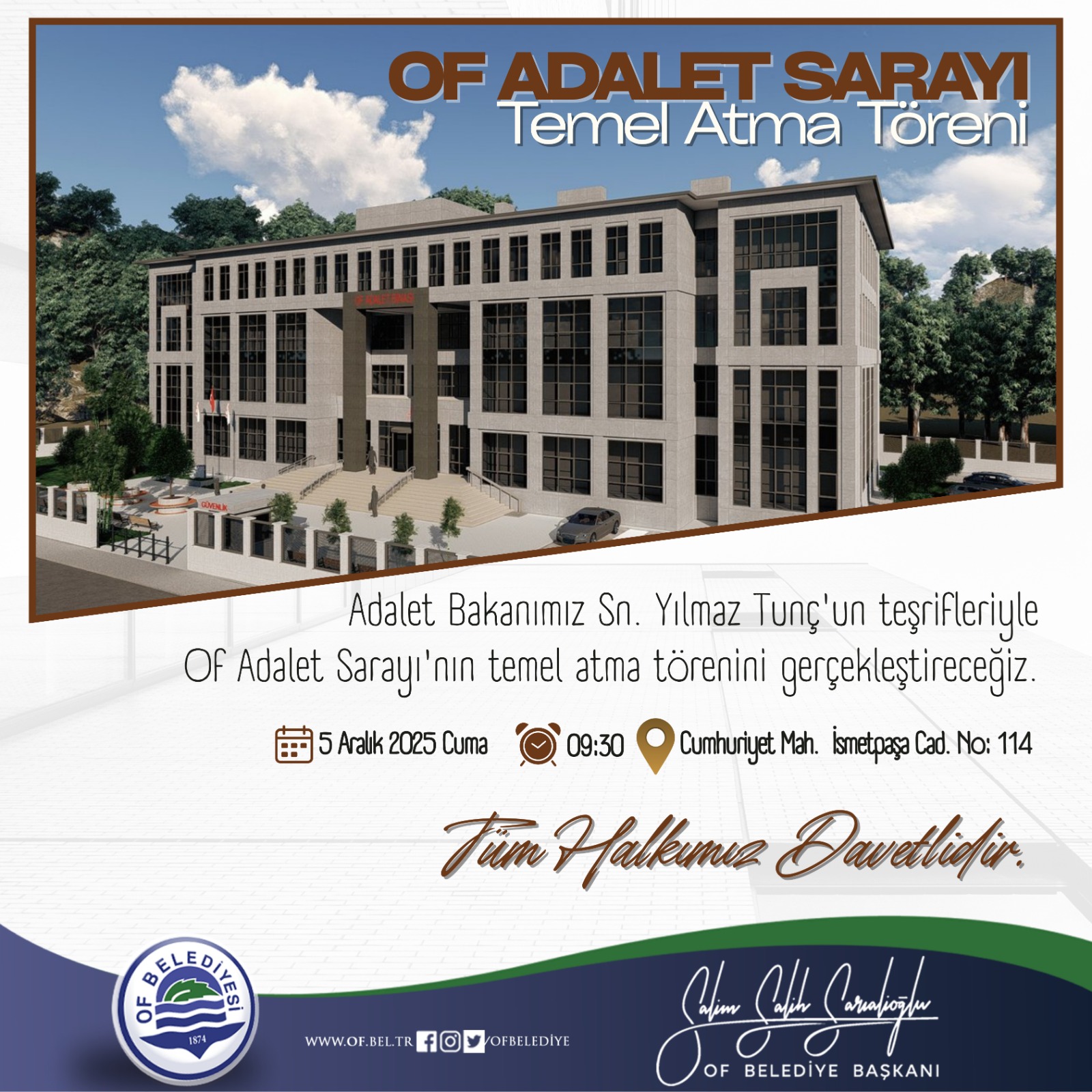 Of Adalet Sarayı’nın temel atma töreni, 5 Aralık 2025 Cuma günü saat 09.30’da Adalet Bakanı Yılmaz Tunç’un katılımıyla gerçekleştirilecek. Törene Ulaştırma ve Altyapı Bakanı Abdulkadir Uraloğlu ile Trabzon milletvekillerinin de katılması bekleniyor. Başkan Sarıalioğlu, “Bu gurur anına tüm hemşehrilerimizi davet ediyoruz” dedi.