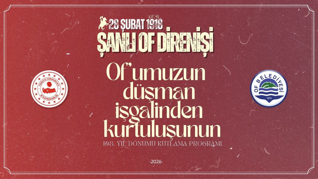 Of’ta kurtuluşun 108. yılı etkinlikleri, 28 Şubat 2026 Cumartesi günü saat 10.00’da Kaymakamlık önündeki Atatürk Anıtı’na çelenk sunulmasıyla başlayacak. Resmi törenin ardından saat 10.30’da Of Belediyesi 1. Kat Konferans Salonu’nda anma programı düzenlenecek. Programda saygı duruşu ve İstiklal Marşı’nın okunmasının ardından protokol konuşmaları yapılacak.