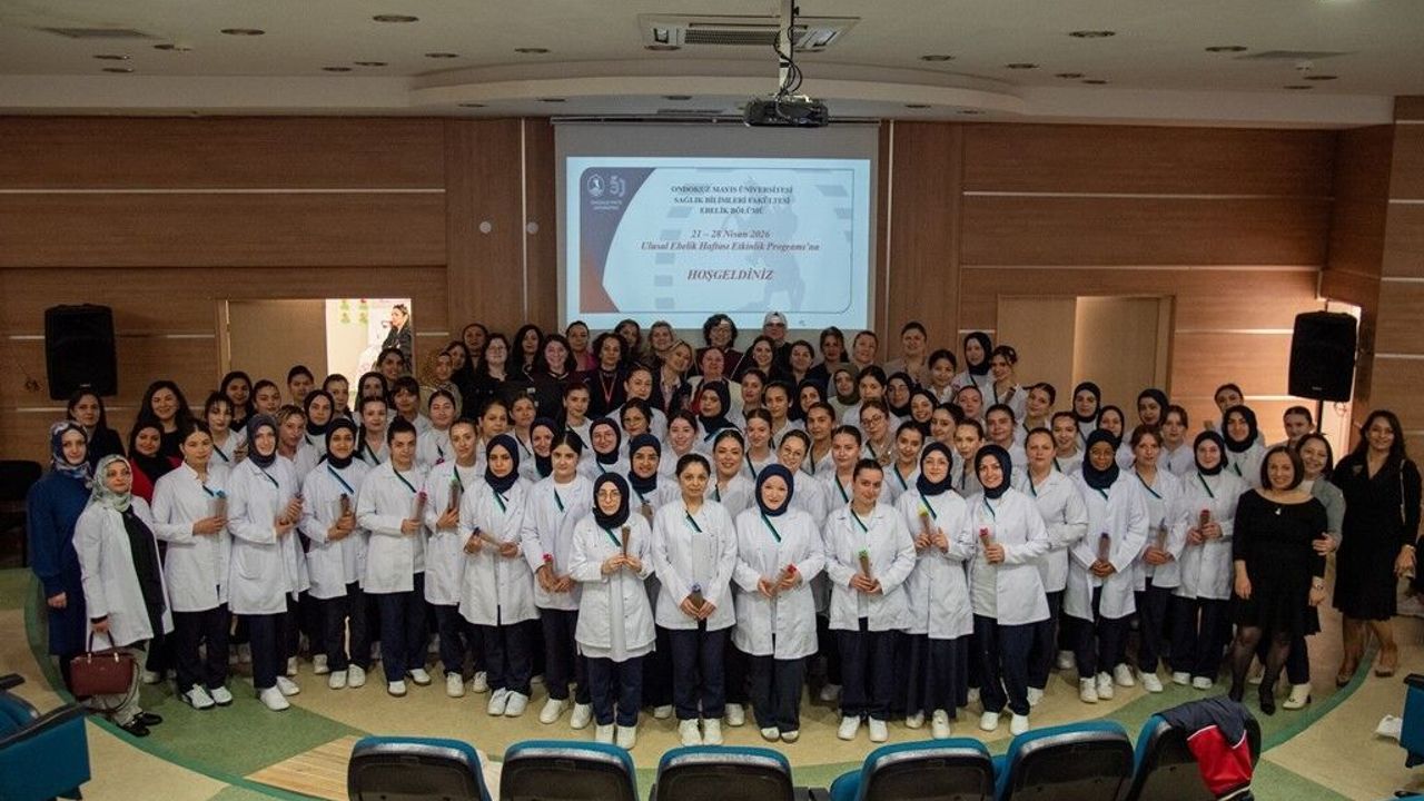 Etkinlik kapsamında gerçekleştirilen mezun-öğrenci buluşmasında, OMÜ Samsun Sağlık Yüksekokulu Ebelik Bölümü 2007 yılı mezunu Uzman Ebe Rukiye Tunç Aydın, 'Ebelikte Mesleki Deneyimler' başlıklı sunumuyla öğrencilerle bir araya geldi. Aydın, saha deneyimlerini ve mesleki birikimini paylaşarak, genç ebe adaylarına yol gösterici bilgiler verdi. Program çerçevesinde düzenlenen törende 66 ebelik öğrencisi fetoskoplarını teslim alarak, meslek yaşamlarına ilk sembolik adımlarını attı. Duygu dolu anların yaşandığı törende öğrenciler sahneye davet edilerek fetoskopları takdim edildi. Etkinliğin devamında Dr. Öğr. Üyesi Nuran Mumcu tarafından 4. sınıf öğrencilerine yönelik 'Doğum Bakım Rehberi ve Partograf Atölyesi' düzenlenirken, dönem boyunca hazırlanan ders materyalleri de sergilendi.