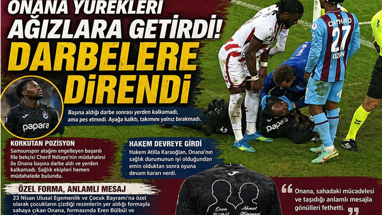 Trabzonspor’un kalecisi Andre Onana, Samsunspor maçında yaşadığı sakatlık korkusuna rağmen oyuna devam etti; özel formasıyla da duygulandırdı.