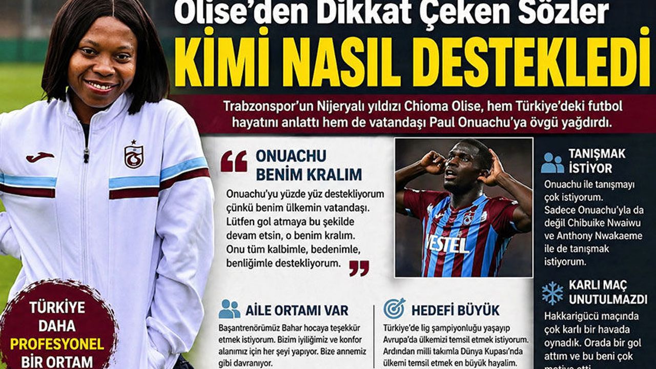 Bordo-mavili takımda aile ortamı bulunduğunu aktaran Olise, "Başantrenörümüz Bahar hocaya teşekkür etmek istiyorum. Bizim iyiliğimiz ve konfor alanımız için her şeyi yapıyor. Her şeyden önce bize annemiz gibi davranıyor ondan dolayı da en büyük teşekkürü ona ediyorum." dedi.