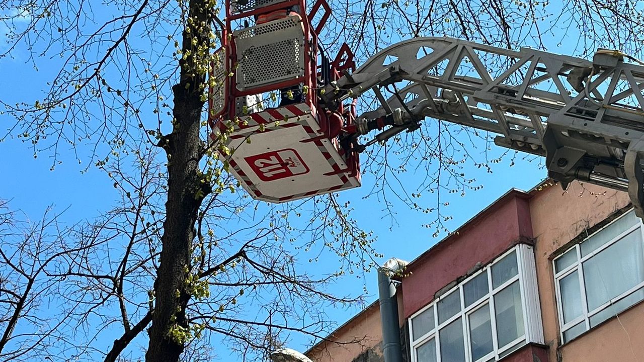 Bölgeye gelen ekipler, kediye itfaiye aracı yardımıyla ulaşarak mahsur kaldığı ağaçtan indirdi.