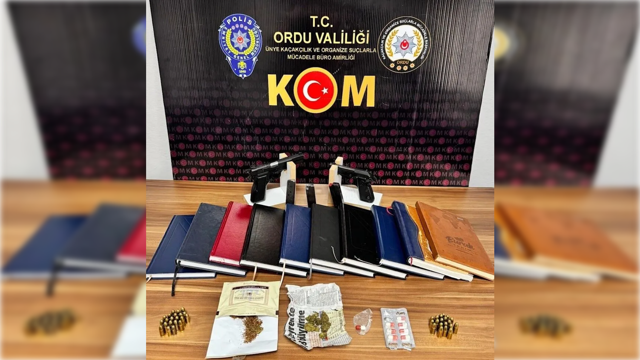 İl Emniyet Müdürlüğü Kaçakçılık ve Organize Suçlarla Mücadele (KOM) Şube Müdürlüğü ekiplerince Ünye ilçesinde operasyon düzenlendi. Şüphelilerin bir ikamet ve bir iş yerinde yapılan aramalarda 2 ruhsatsız tabanca, bu silahlara ait toplam 40 fişek, 4,96 gram esrar, 21,06 gram esrar karışımlı tütün, 8 adet uyuşturucu hap ile 10 adet alacak-verecek defteri ele geçirildi.