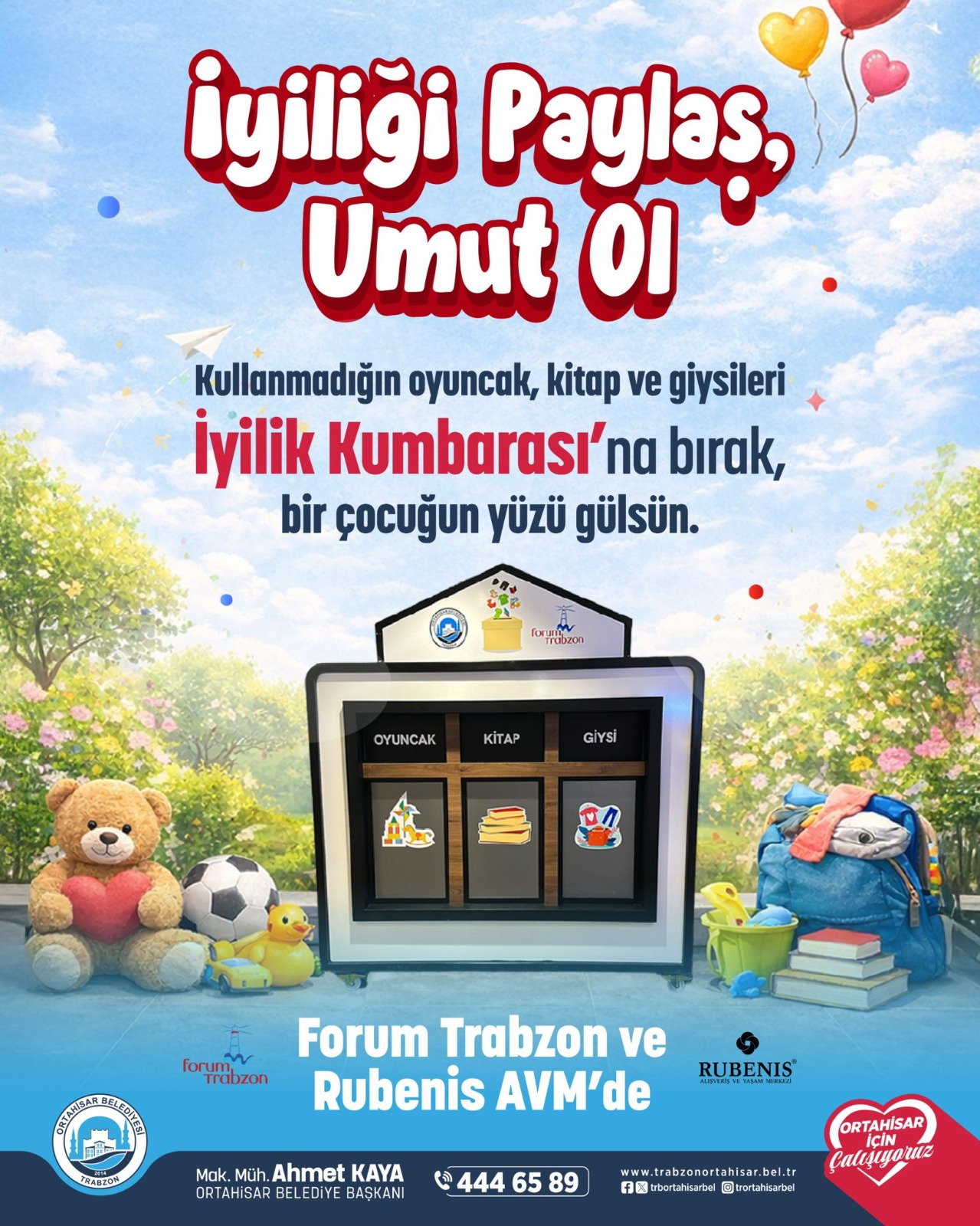 Ortahisar Belediyesi, dayanışma kültürünü yaygınlaştırmak ve ihtiyaç sahibi çocuklara destek olmak amacıyla “İyilik Kumbarası” adlı sosyal sorumluluk projesini hayata geçirdi. “Bir Paylaşım, Bir Umut” sloganıyla yola çıkan proje kapsamında, vatandaşların kullanmadığı ama sağlam durumda olan oyuncak, kitap ve giysiler toplanarak çocuklara ulaştırılacak. Proje, Forum Trabzon AVM ve Rubenis AVM iş birliğiyle yürütülüyor. Ortahisar Belediye Başkanı Ahmet Kaya, projenin çocukların hayatında anlamlı izler bırakacağını vurguladı.