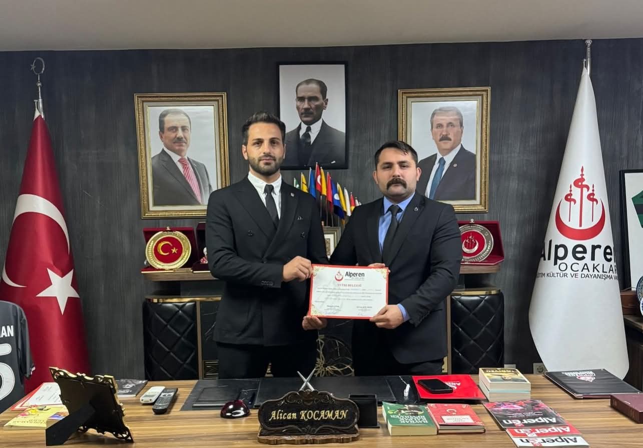 Alperen Ocakları Genel Başkanı Alican Kocaman Trabzon Şube Başkanlığı’na Oğuzhan Üçüncü’nün atanmasına dair belgeyi kendisine takdim etti.