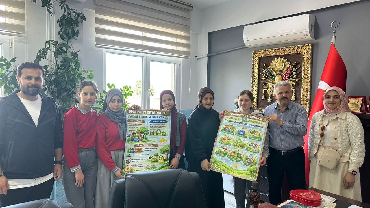 Pınaraltı Ortaokulundan Proje Koordinatör Öğretmeleri Din Kültürü ve Ahlak Bilgisi Öğretmeni Ayşenur Karın, Beden Eğitimi Öğretmeni Münür Satılmış ve görevli bir grup öğrenci İlçe Milli Eğitim Müdürü İdris Kabahasanoğlu’nu ziyaret ederek projelerini anlattılar.