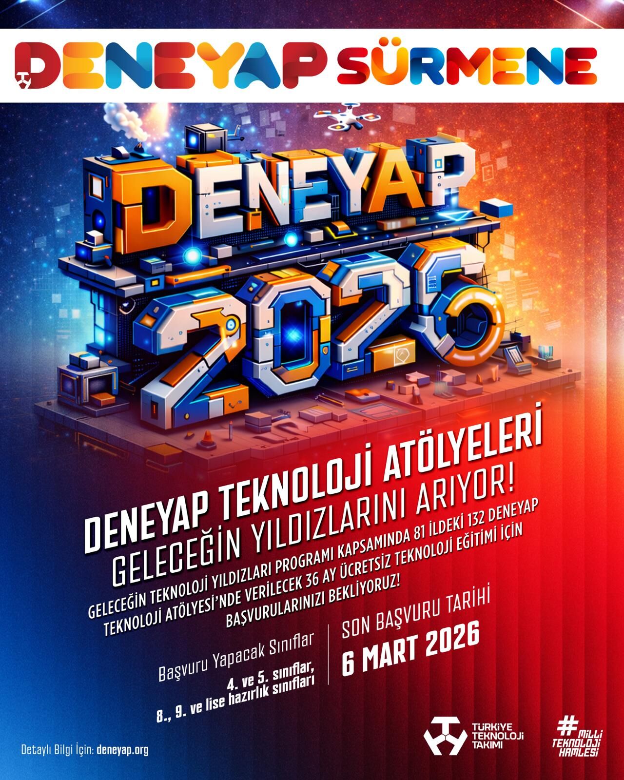Trabzon'un Sürmene İlçesinde Deneyap Teknoloji Atölyelerinde geleceğin yıldızları aranıyor. 6 Mart'a kadar sürecek başvurular deneyap.org adresi üzerinden yapılacak. 4,5,8 ve 9. sınıf öğrencilerine çağrı yapan Belediye Başkanı Hüseyin Azizoğlu, "Geleceğin teknoloji yıldızları programı kapsamında öğrencilerimize ücretsiz ve uygulamalı teknoloji eğitim fırsatı sunulan Trabzon'un 3. Deneyap'ı Sürmene Teknoloji Atölyesinde. Sen de yerini al. Bilim ve teknoloji yolculuğuna seni de bekliyoruz" dedi.