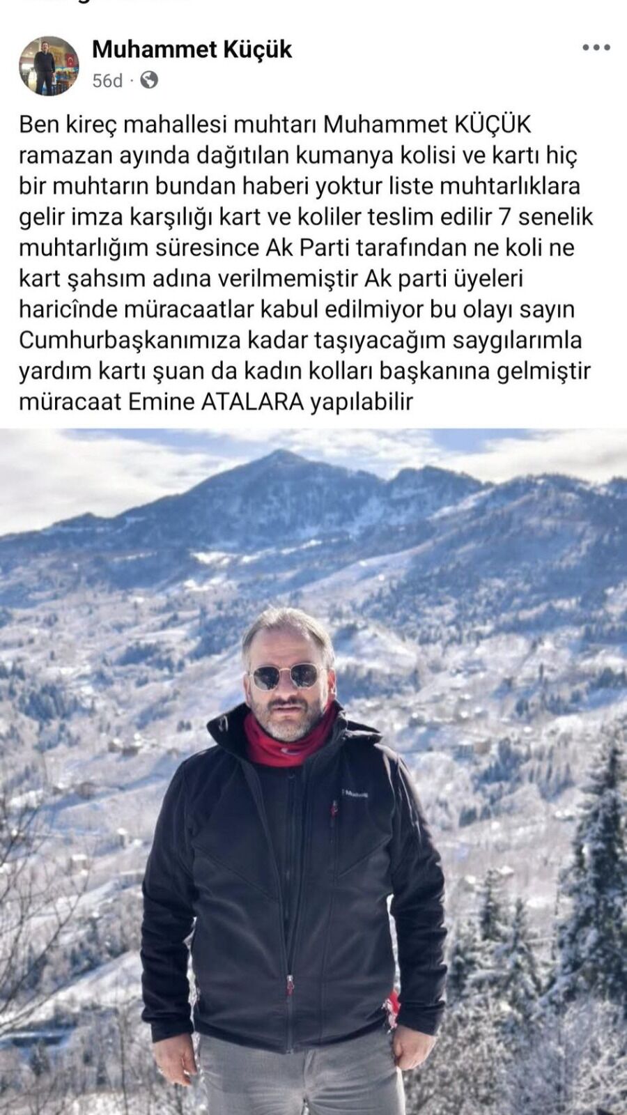 Kireç Mahallesi Muhtarı Muhammet Küçük, Ramazan ayında dağıtılan kumanya kolileri ve yardım kartlarıyla ilgili yaptığı paylaşımda, süreçten muhtarların haberdar edilmediğini öne sürdü. Küçük, yardım kolilerinin AK Parti üzerinden dağıtıldığını iddia ederek, normal şartlarda listelerin muhtarlıklara gelmesi ve imza karşılığı teslim yapılması gerektiğini ifade etti.