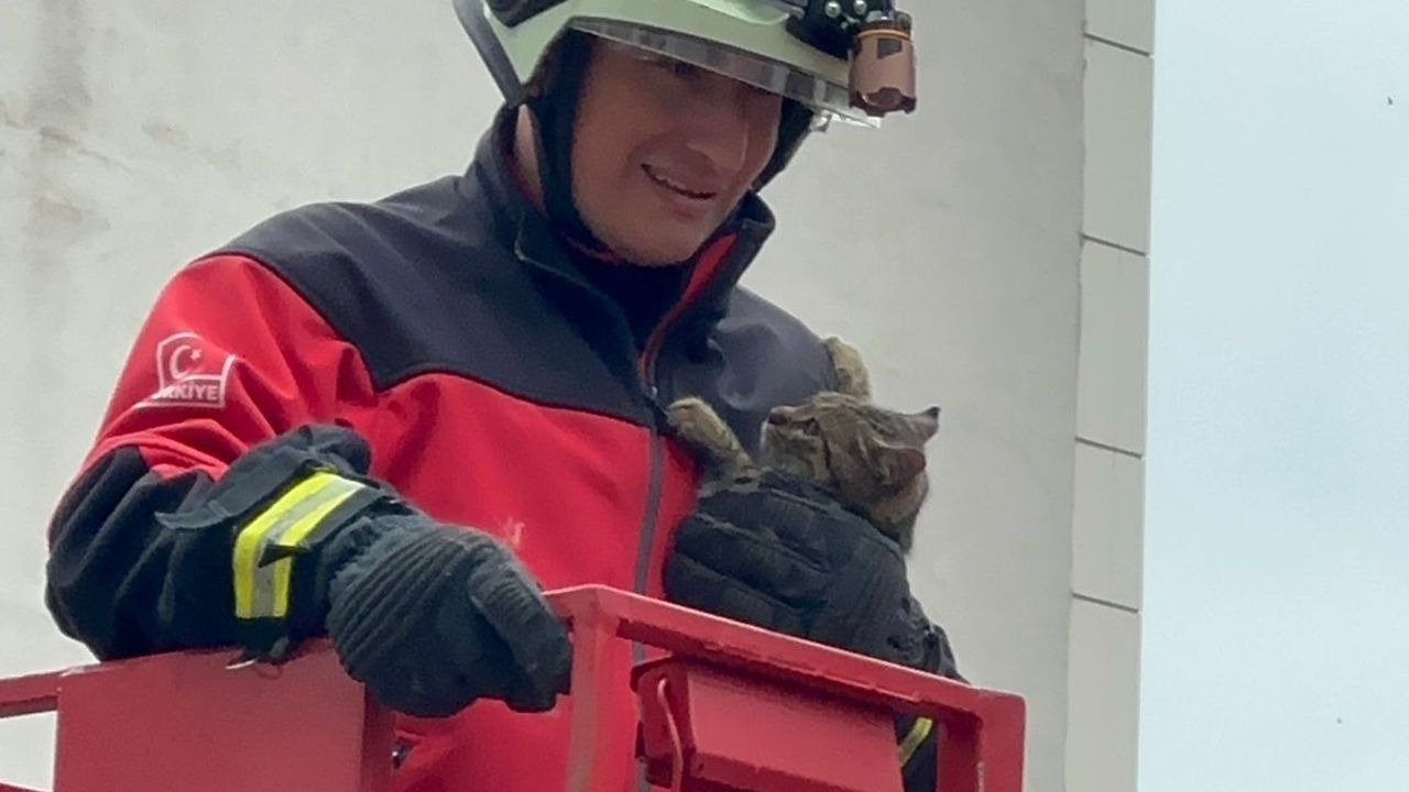 Çarşı Mahallesi Anafartalar Caddesi'ndeki bir ağaca tırmanan kedinin inemediğini gören vatandaşlar, durumu itfaiye ekiplerine bildirdi.