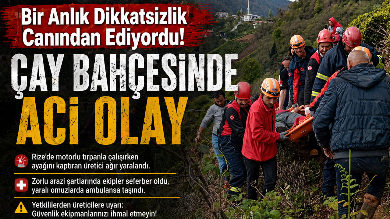 Rize’de yaş çay sezonu öncesi bahçe hazırlıklarını sürdüren H.L. üretici, motorlu tırpanın kesici kısmına ayağını kaptırarak ağır yaralandı. Zorlu arazi şartlarında gerçekleştirilen kurtarma operasyonuyla hastaneye kaldırılan yaralının tedavisi sürüyor. Yaş çay sezonunun yaklaşmasıyla birlikte bahçesinde budama işlemlerine başlayan H.L. isimli üretici, motorlu tırpanla çalışma yaptığı sırada bir anlık dikkatsizlik ve denge kaybı yaşadı. Kontrolden çıkan çalışır vaziyetteki tırpanın kesici ucu talihsiz adamın ayağına isabet etti.