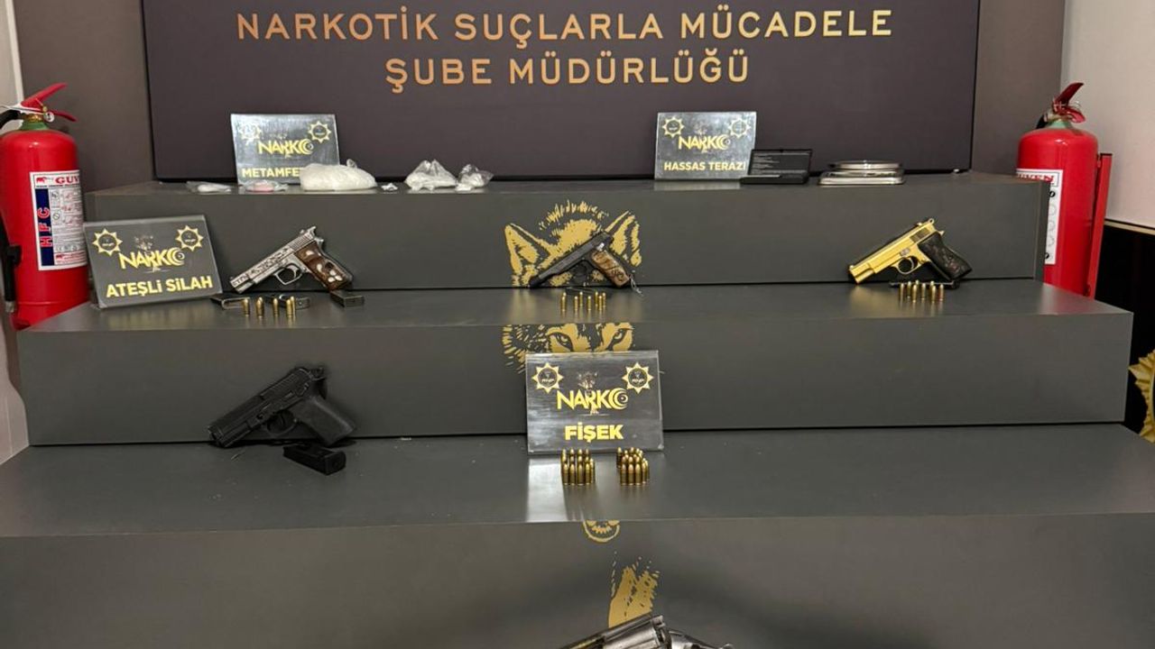 Ekipler, şüphelilerin ev, iş yeri, araç ve üzerlerinde yaptıkları aramada, 190,92 gram metamfetamin, 1,7 gram esrar, 4 ruhsatsız tabanca, 55 tabanca fişeği ve ruhsatsız tüfek ele geçirdi.