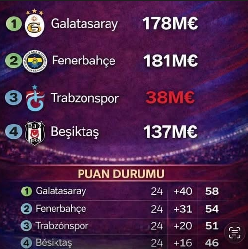 Rakamlar konuşuyor… Lider Galatasaray 178 milyon Euro. İkinci Fenerbahçe 181 milyon Euro. Dördüncü Beşiktaş 137 milyon Euro.