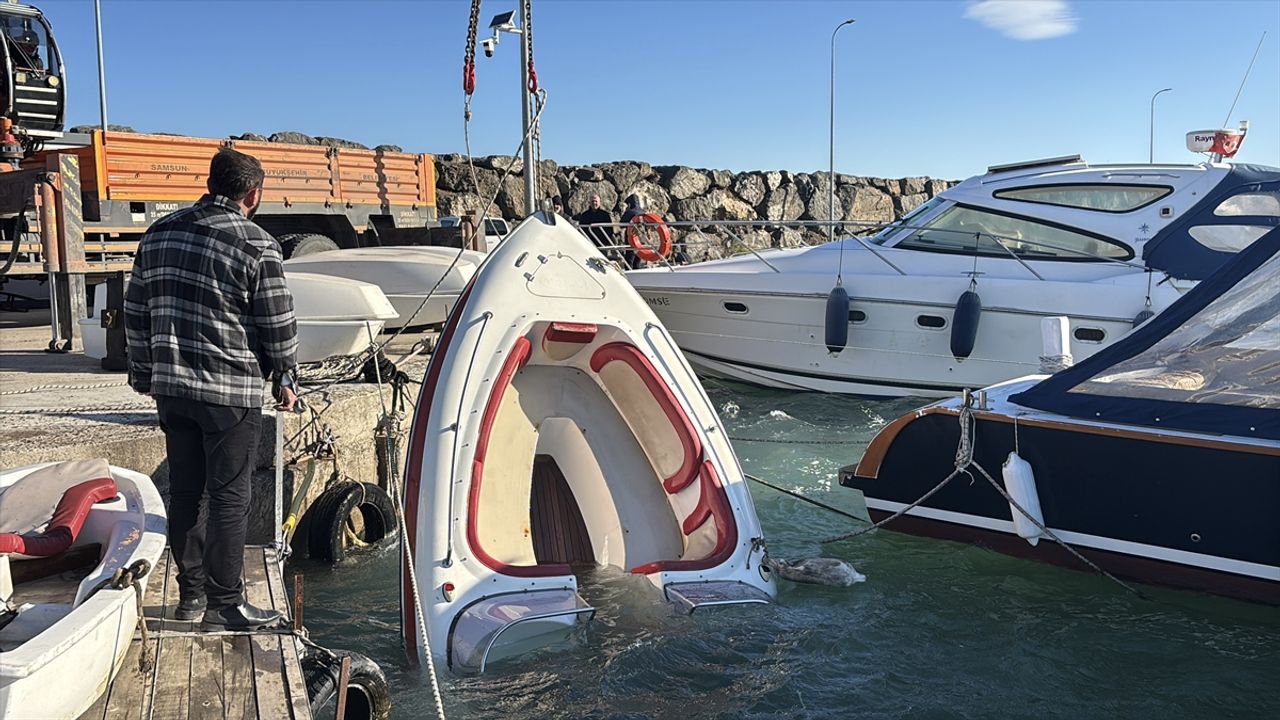 Körfez Mahallesi Kurupelit Yat Limanı'nda iskeleye bağlı halde bulunan Samsun Büyükşehir Belediyesine ait tekne, kuvvetli rüzgar nedeniyle alabora oldu.