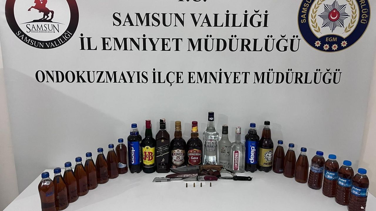 Araç içinde yapılan aramada, çok sayıda yapma alkol olduğu değerlendirilen şişeler, 4 bıçak ve 4 tabanca fişeği ele geçirildi.
