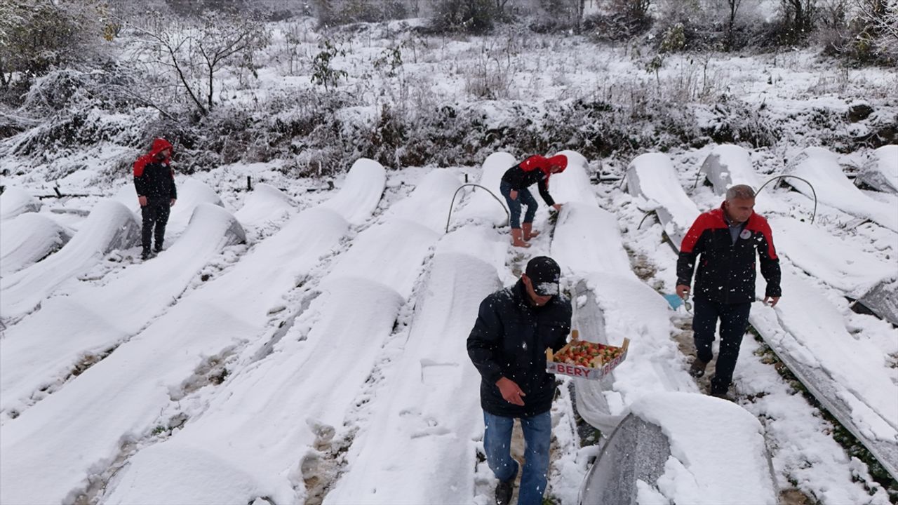 Bölgede etkili olan kar yağışına rağmen üreticiler çilek hasadını sürdürdü.