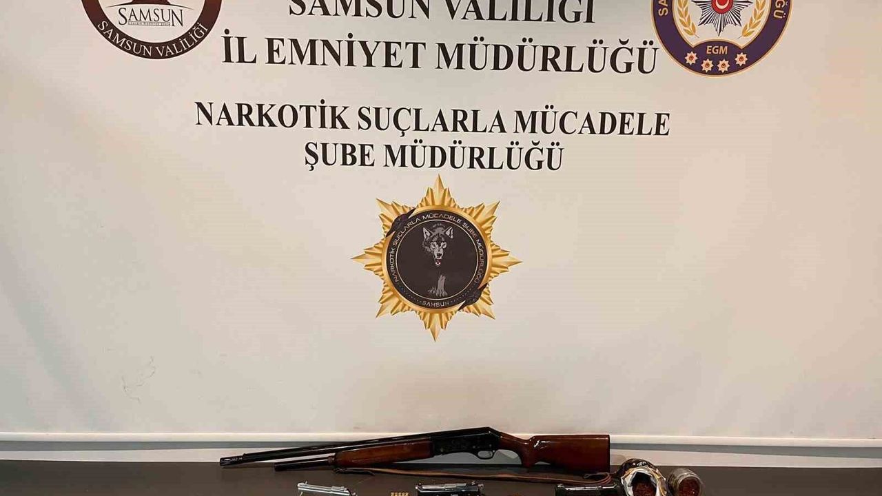 Samsun İl Emniyet Müdürlüğü Narkotik Suçlarla Mücadele Şube Müdürlüğü ekiplerince İlkadım ilçesinde yasaklı madde ticareti ve kullanımının önlenmesine yönelik gerçekleştirilen operasyonda bir ikamete baskın düzenlendi. Yapılan aramalarda 3 adet ruhsatsız tabanca, 1 adet ruhsatsız tüfek, 69 adet tabanca fişeği, 35 gram sentetik kannabinoid, 36 gram esrar ve 1 adet hassas terazi ele geçirildi. Operasyon kapsamında A.A. isimli şahıs gözaltına alındı.