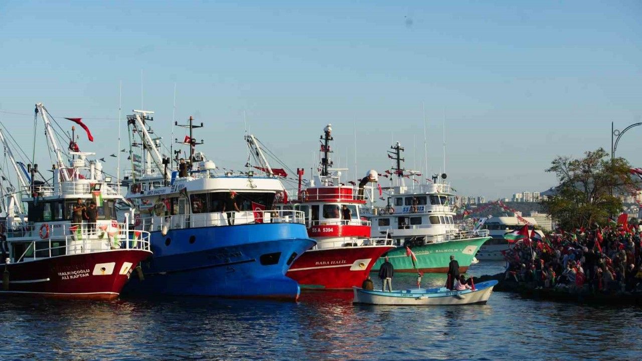 Samsun’da onlarca gemi ve tekne, Filistin’e destek amacıyla Samsun Limanı’nda bir araya geldi. Türk ve Filistin bayraklarıyla donatılan tekneler sirenler çalarak denizde kortej oluştururken, karadan yüzlerce vatandaş da ellerinde bayraklarla eyleme destek verdi.