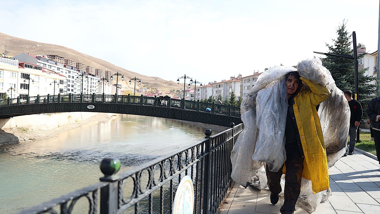 Kent merkezindeki Çoruh Nehri üzerinde yer alan DSİ köprüsüne gelen Erzincan Binali Yıldırım Üniversitesi Güzel Sanatlar Fakültesi Dekanı Prof. Dr. Kavukcu, köprü üzerinde boyadığı naylonu nehirden kovayla çektiği suyla temizledi.