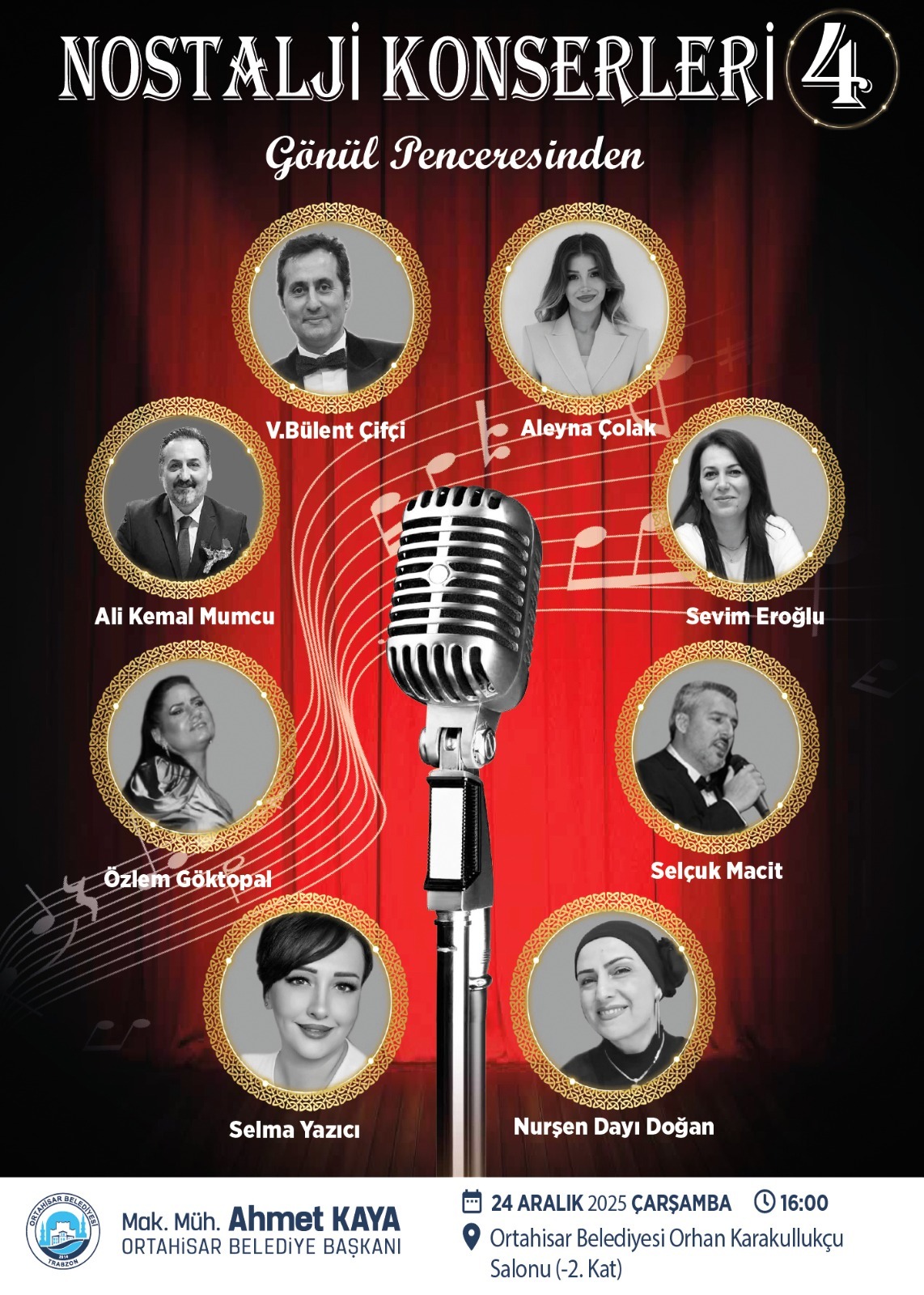 Ortahisar Belediyesi, müzikseverlerin hafızalarında derin izler bırakan, Türk sanat müziğinin unutulmaz eserlerinin seslendirileceği Nostalji Konserleri’nin dördüncüsünü, ‘Gönül Penceresinden’ temasıyla 24 Aralık Çarşamba düzenleyecek. Ortahisar Belediyesi, kentin sosyal yaşamına ve kültür merkezi kimliğine değer katan kültür ve sanat etkinliklerini düzenlemeye devam ediyor. Bu kapsamda, Ortahisar Belediyesi Kültür ve Sosyal İşler Müdürlüğü tarafından düzenlenen Nostalji Konserlerinin dördüncüsü, ‘Gönül Penceresinden’ temasıyla sanatseverlerle buluşmaya hazırlanıyor.