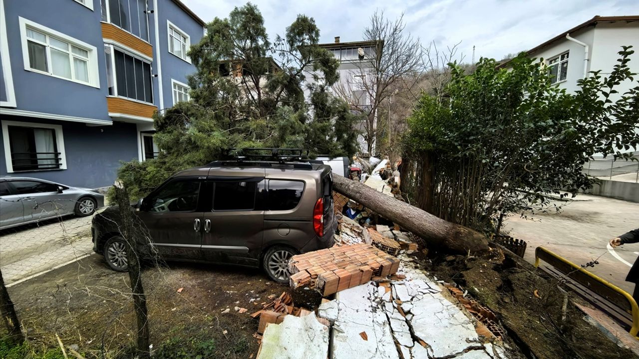 Dalları kırılan ağaçlar, yol kenarında park halinde bulunan 3 aracın üzerine devrildi.