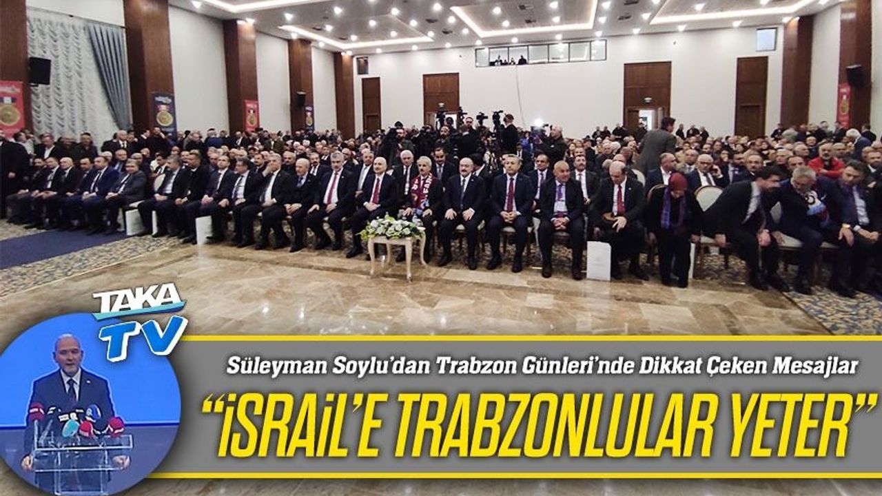 Ayrıca Trabzonlulara da özel bir vurgu yapan Soylu, “İsrail’e Trabzonlular yeter” sözleriyle salondan yoğun alkış aldı.
