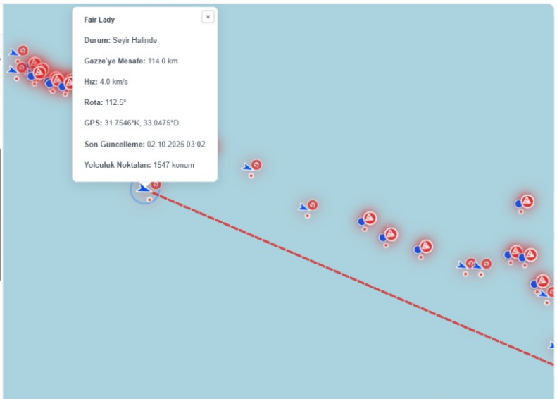 Son verilere göre filo, Akdeniz’in doğu kesiminde, Gazze açıklarına doğru uluslararası sularda ilerliyor. Ancak güvenlik gerekçesiyle bazı tekneler konum verilerini periyodik olarak gizli tutuyor. Filonun rotası, İsrail deniz kuvvetlerinin bölgede devriye gezmesi nedeniyle zaman zaman değişebiliyor.