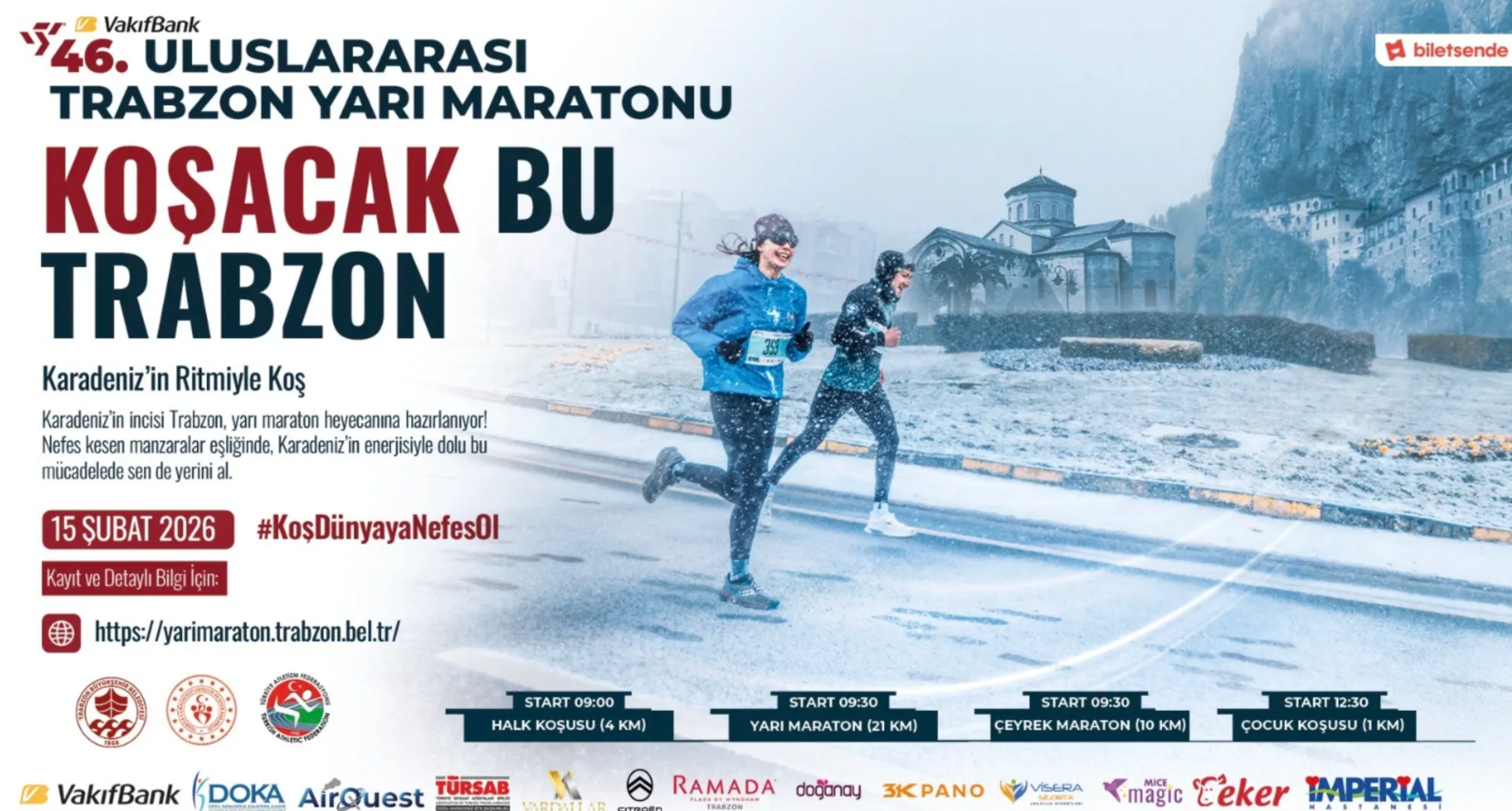 Trabzon’da 15 Şubat 2026 Pazar günü düzenlenecek VakıfBank 46. Uluslararası Trabzon Yarı Maratonu için geri sayım başladı. Trabzon Büyükşehir Belediyesi Gençlik ve Spor Hizmetleri Dairesi Başkanlığı'nca organize edilen geleneksel maratonun bu yılki mottosu “Koş Dünyaya Nefes Ol” olarak belirlendi. Maraton kapsamında, ülkemizde meydana gelen orman yangınlarına ve yangınların önlenmesine yönelik toplumsal farkındalık oluşturulması hedefleniyor. Maratona aralarında Amerika, Antarktika ve Çad'ın da bulunduğu 41 farklı ülkeden sporcular katılacak.