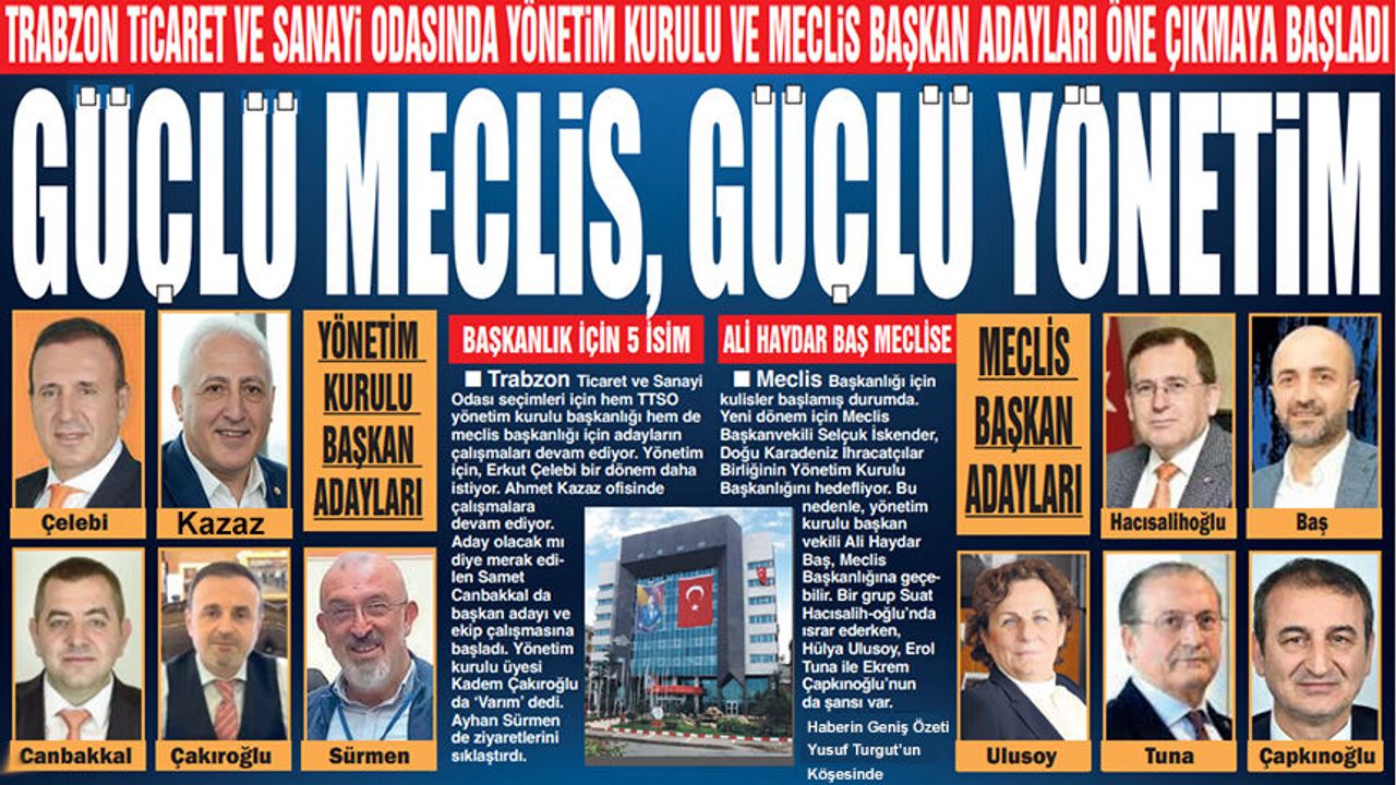 Trabzon Ticaret ve Sanayi Odası seçimleri için hem TTSO yönetim kurulu başkanlığı hem de meclis başkanlığı için adayların çalışmaları devam ediyor. Yönetim için, Erkut Çelebi bir dönem daha istiyor. Ahmet Kazaz ofisinde çalışmalara devam ediyor. Aday olacak mı diye merak edilen Samet Canbakkal da başkan adayı ve ekip çalışmasına başladı. Yönetim kurulu üyesi Kadem Çakıroğlu da ‘Varım’ dedi. Ayhan Sürmen de ziyaretlerini sıklaştırdı.