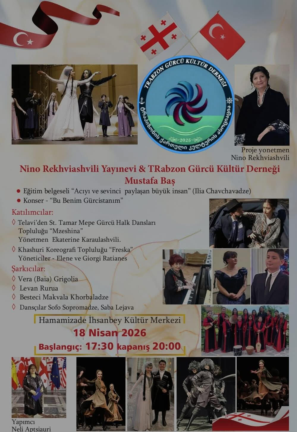 Trabzon'da muhteşem bir gece yaşanacak 75 kişilik dev bir kadro ile Gürcistan halk oyunları dans gösterisi ve müzik etkinliği düzenlenecek. Trabzon Gürcü Kültür Derneği, Gürcü Dili Koruma Haftası kapsamında 18 Nisan 2026 tarihinde "Gürcü dili ve kültürü" konulu etkinlik düzenleyecek. Gürcistan’ın Tiflis şehrinden ünlü yazar ve akademisyen Nino Rekhviashvili öncülücülük edeceği etkinlik 75 kişilik dev bir kadro eşliğinde gerçekleşecek.