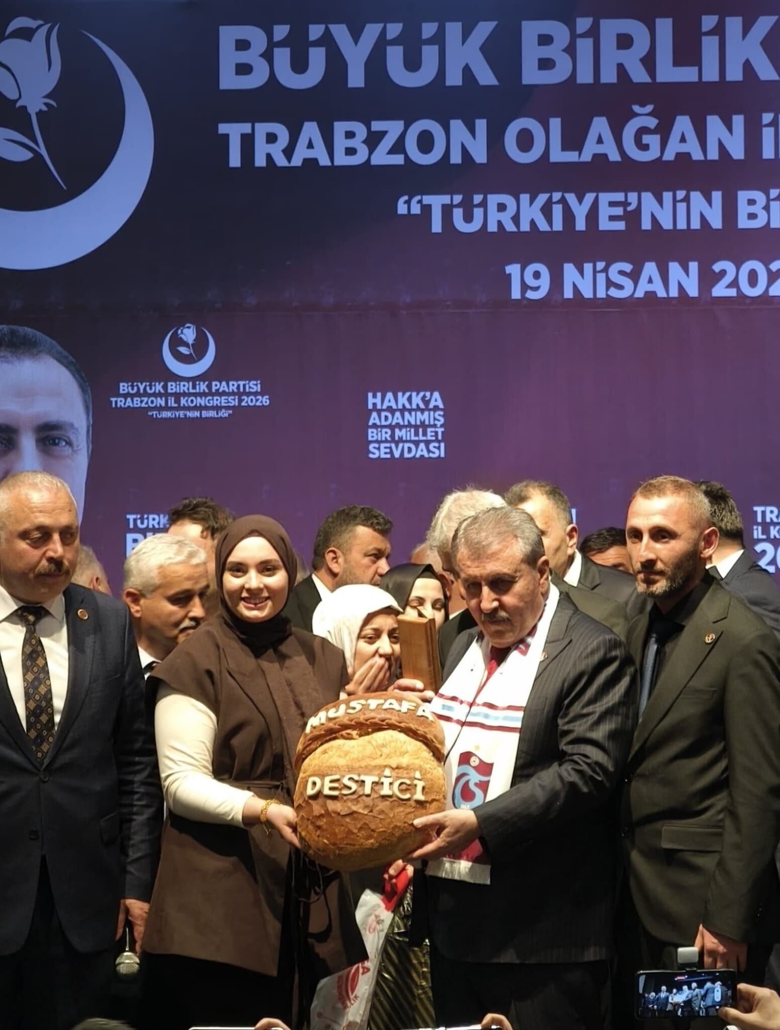 Büyük Birlik Partisi’nin Trabzon’da düzenlenen olağan il kongresi, renkli bir anıya sahne oldu. Kongreye katılmak üzere kente gelen Genel Başkan Mustafa Destici’ye, Büyük Birlik Partisi Vakfıkebir İlçe Başkanı İsmail Şeref ve Yönetim Kurulu Üyesi Rabia Şeref tarafından Vakfıkebir Ekmeği hediye edildi.