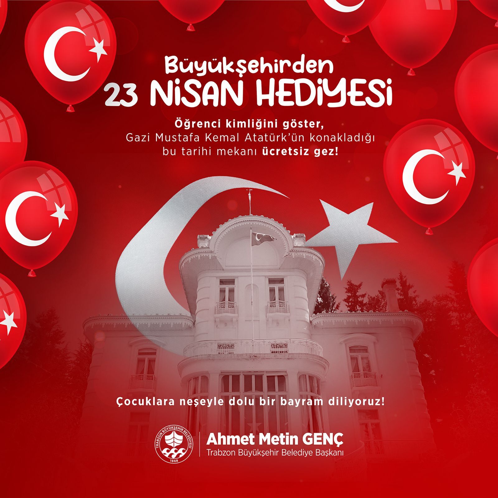 Trabzon Büyükşehir Belediyesi, 23 Nisan Ulusal Egemenlik ve Çocuk Bayramı kapsamında ilkokul ve ortaokul öğrencilerini Atatürk Köşkü’nde ücretsiz ağırlayacak. Trabzon Büyükşehir Belediyesi, kentin önemli simgelerinden biri olan ve Gazi Mustafa Kemal Atatürk’ün üç kez konakladığı Atatürk Köşkü'nün kapılarını 23 Nisan'da çocuklara ücretsiz açacak. Uygulamadan ilk ve ortaokul öğrencileri yararlanabilecek.