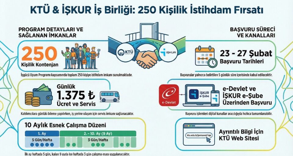 Üniversite ile İŞKUR iş birliğinde yürütülen İşgücü Uyum Programı kapsamında 250 kişi için istihdam fırsatı sunuluyor. Başvurular 23-27 Şubat 2026 tarihleri arasında yapılacak.