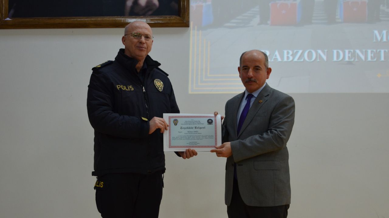 Trabzon Şehit Meriç Alemdar POMEM Müdürü İsmail Akıntürk, konferansın ardından Semiz'e teşekkür belgesi verdi.